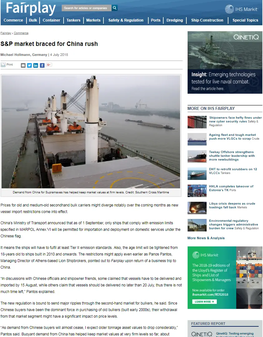 - Fairplay 04th July 2018 – S&P market braced for China rush