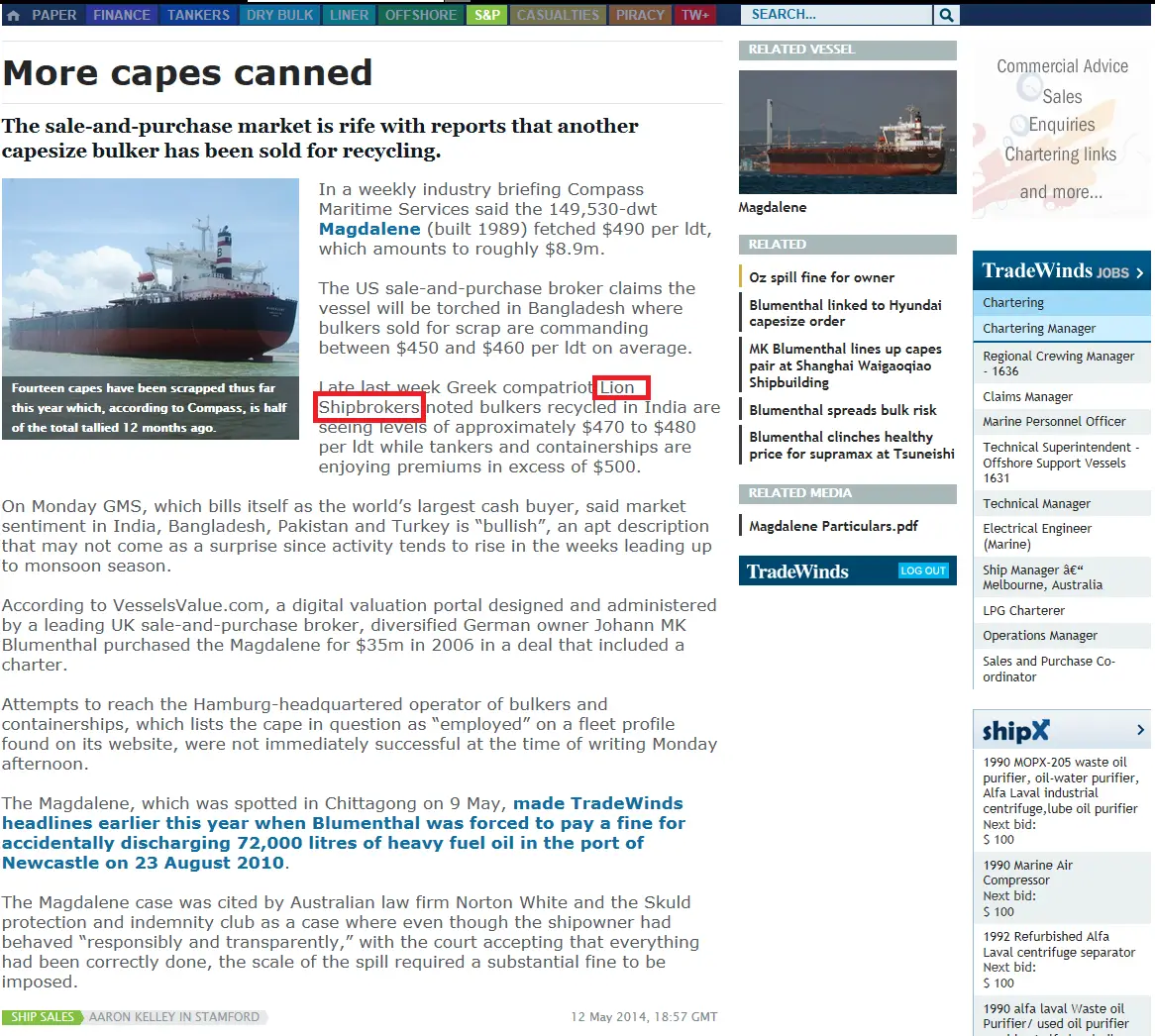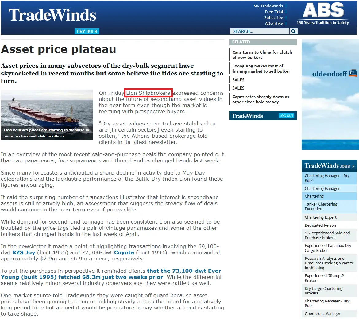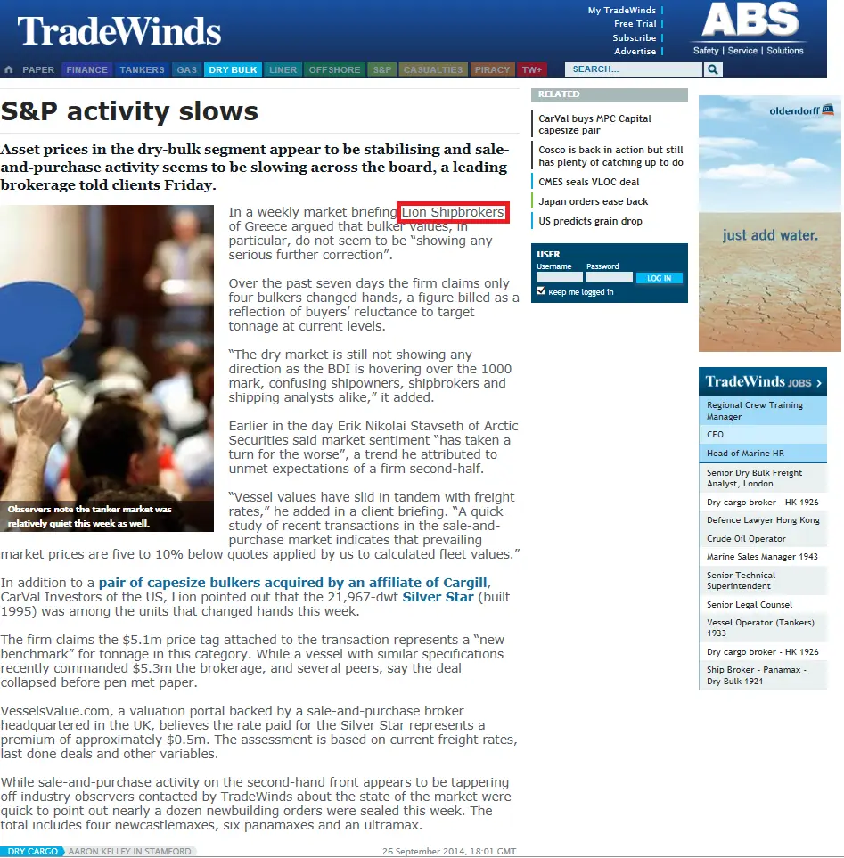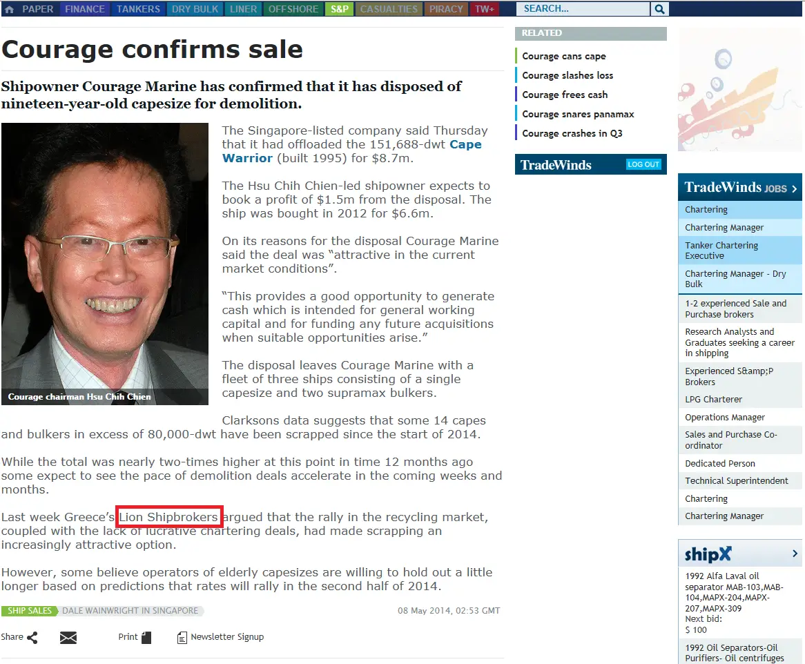 - Trade Winds, 24 June 2011 Lion Shipbroker set up shop in Piraeus