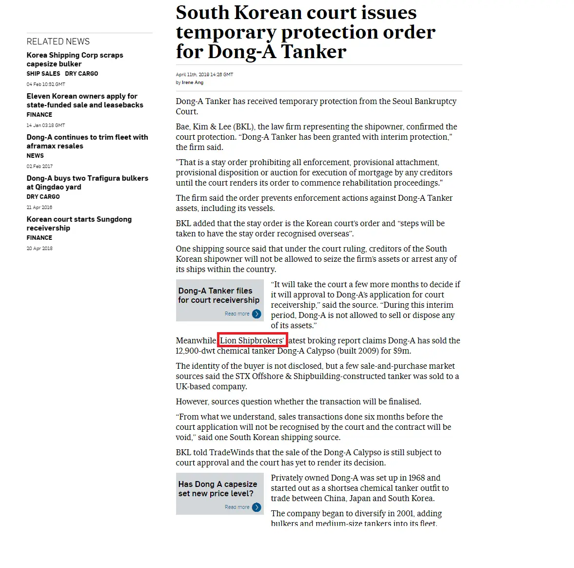 - Tradewinds 11th April 2019 – South Korean court issues temporary protection order for Dong-A Tanker
