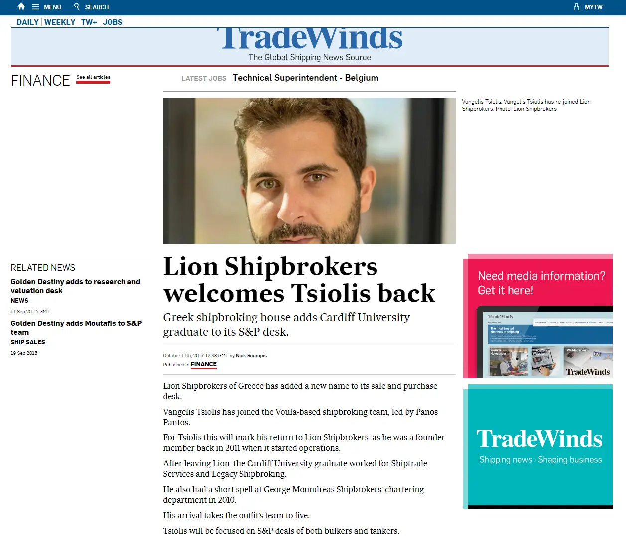 - Tradewinds October 11th 2017 – Lion Shipbrokers welcomes Tsiolis back
